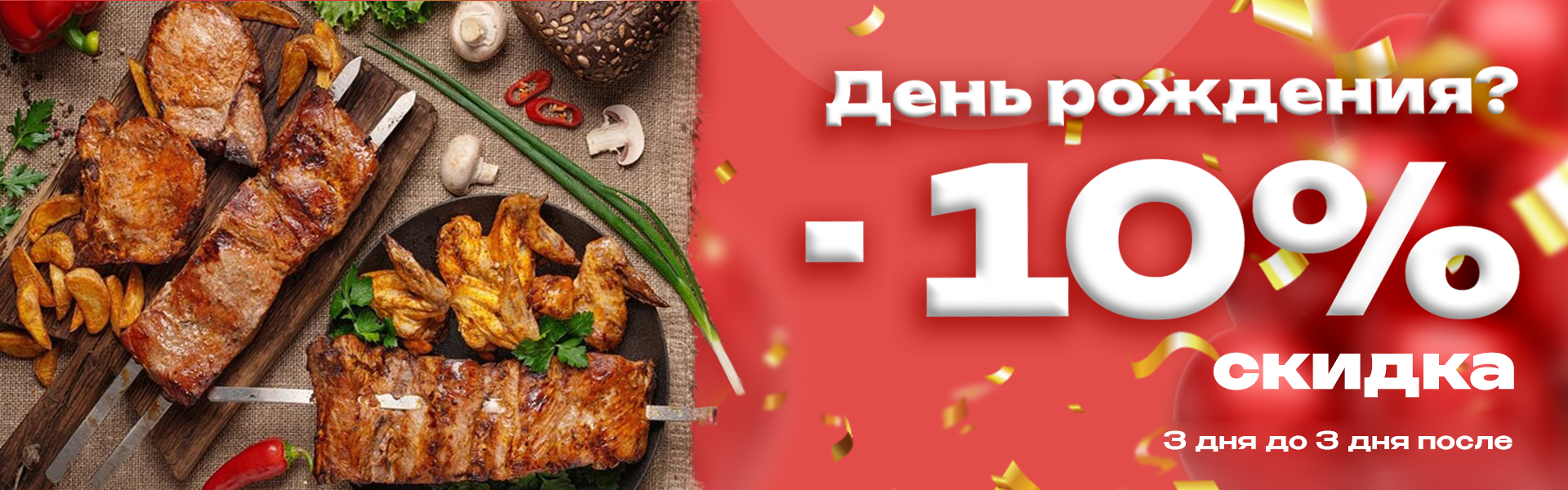 В день рождения мы подарим скидку 10% на самовывоз и 10% на доставку.