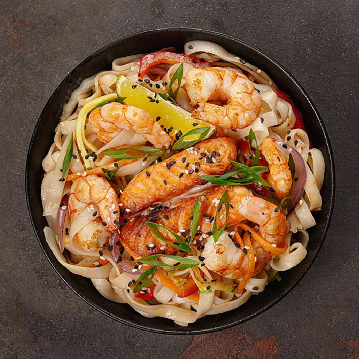 Филе семги, креветки, удон, кабачки, морковь, перец болгарский, кунжут, чеснок, кисло-сладкий соус, лук, лайм.